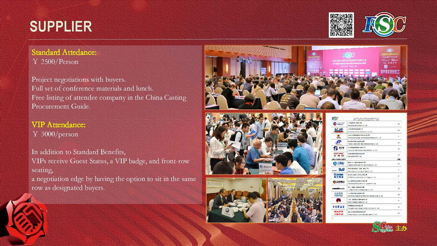 FSC will set stands for suppliers and recommend suitable purchasers 90 days before the conference opening. Fees: $1000 per booth for casting suppliers;